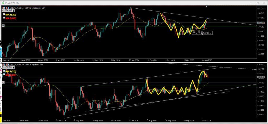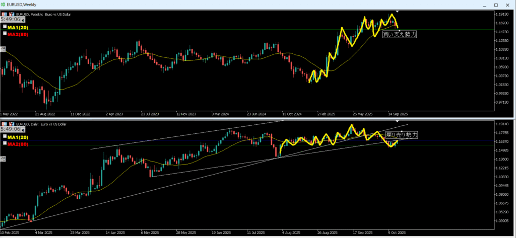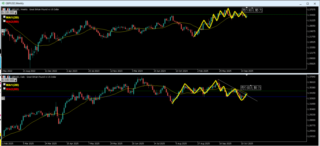 前回安値とチャンネル抜けリバースタッチが重なるエリアでの戻り売りなので日足としては絶好の売りエリアだと思うが、週足の買い支えがいるので戦争状態が起こりそう。