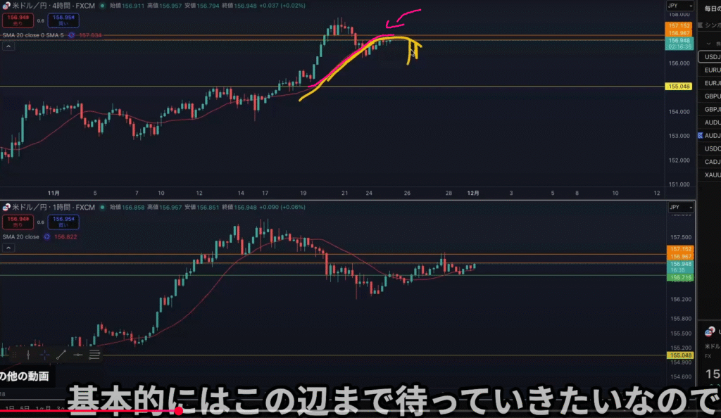 ・浅い方の水平線は4hのダウが見えていて、押してきた場合浅い方の水平線が意識される可能性もある
