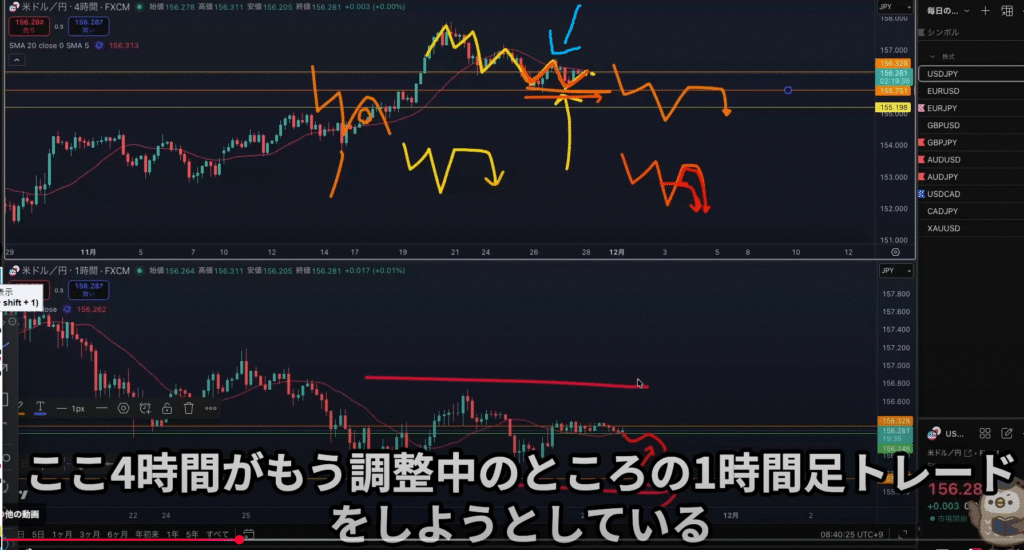 少し待ってから下を考える、すなわち4h一旦上昇をやり過ごして1hのトレンド発生を待つ