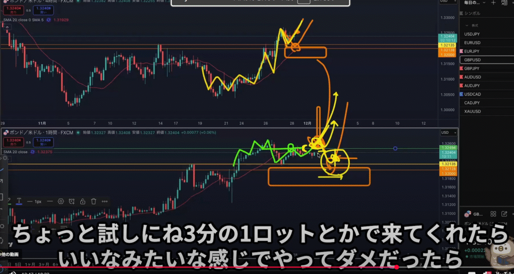 黄色の4hの波を見てこれは普段と違うなって感じ取れないといけない、普段は水色の波を狙って緑のグランビルするまでの波までは狙い続ける、これが言語化は合っているのに勝ったり負けたりを繰り返す要因。