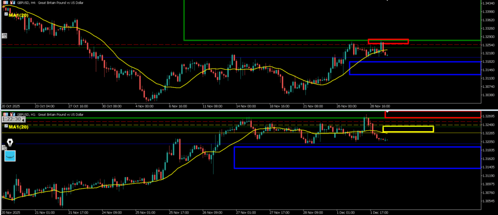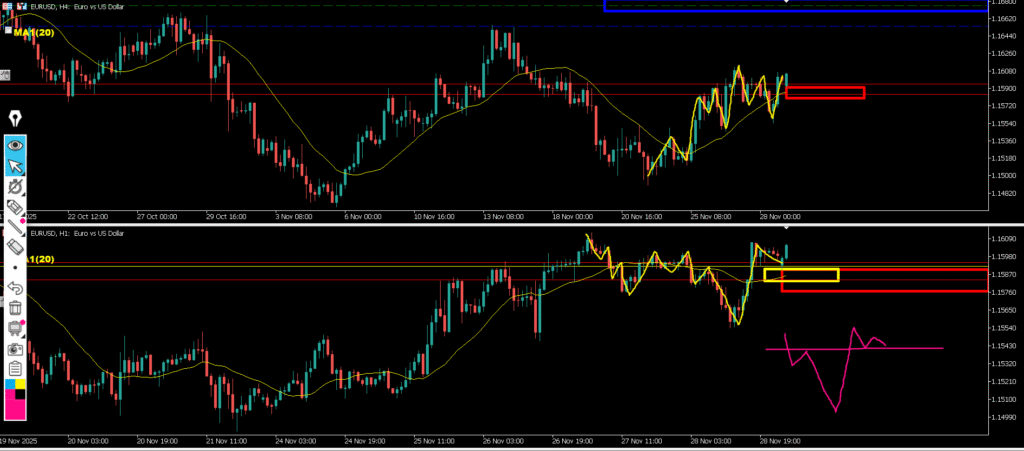 今1hが止まっているところが1hのダウで1hで資金が一気に入ってきたローソク足に引いた水平線まで下降してくる可能性もある。