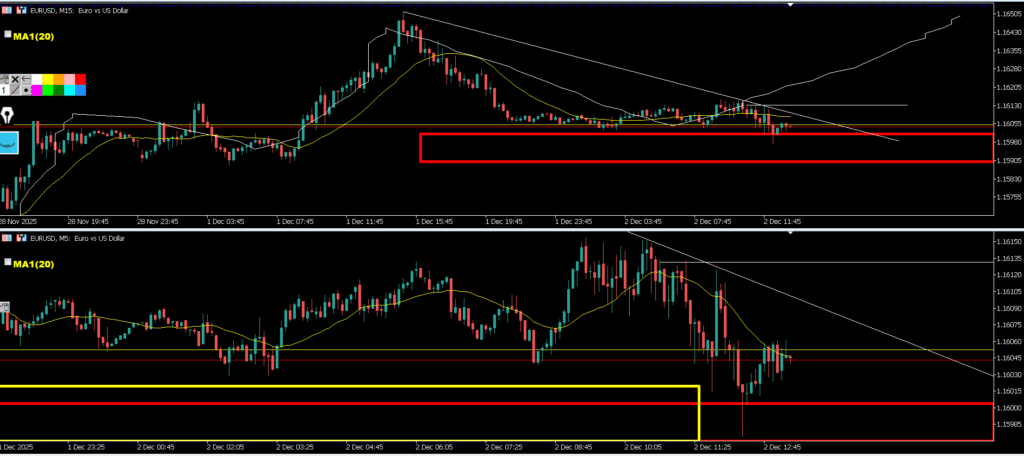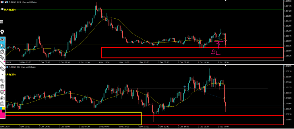 4h戻し過ぎからの1h下降トレンド発生15mネックライン抜けでエントリー
