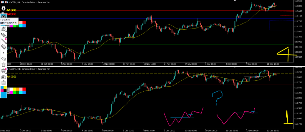←4h全戻しから1hトレンド発生後エントリーと考えていたが、塾長は小さくダウカウントして戻り売りと考えていたのでそもそも環境認識が間違っていた、結果的には多少波は出たーーーー