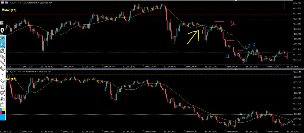 殆ど含み損になる事が無くスムーズに下降していき15mダウが形成される毎に移動させていった、見れていたらポジション②③は日足サポートラインまでの下降がありそうだったのでSLを少し上げて15mダウ崩れローソク足確定まで待っての損切をしたかったが置いておいたSLに刺さって決済となった。