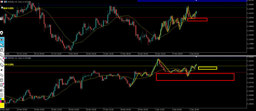 週足MAには抑えられていて日足MAには支えられているので上位足では戦争状態になりやすい、週足と日足のレジスタンスラインがすぐ近くにあるので大きな波が出るとは思えない、今は4h押し目買いの波の途中だが週足日足のレジスタンスライン辺りまでかなと感じる。