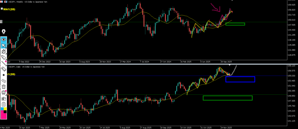 ・週足なのでまだ確定はしていないが点線を抜けてTTSの卵になりつつある、このままMAを抜けるとTTSで上目線に変わる