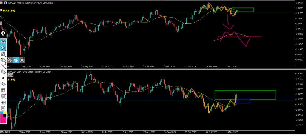 日足が上になり週足も上になりつつある、4h押してきたら押し目買いを考えていきたいのでそれまでは静観。