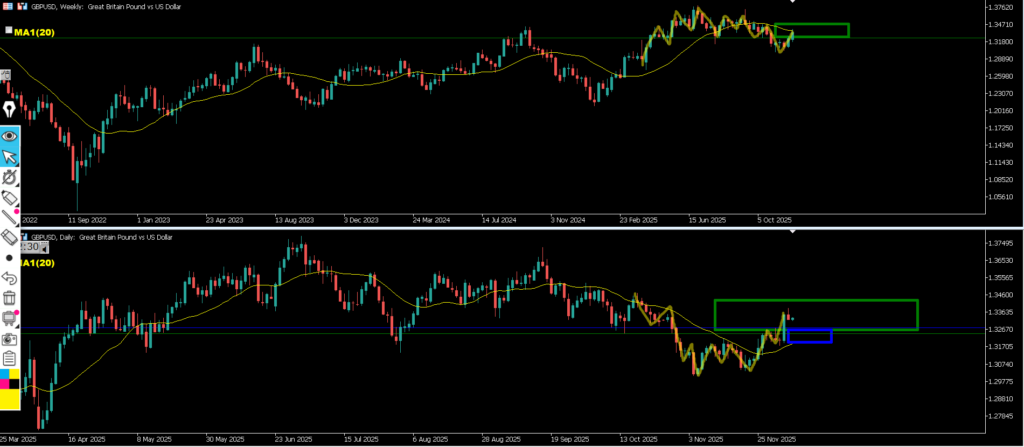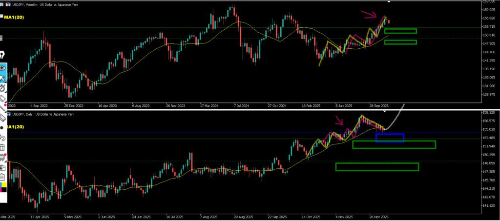 日足のサポートラインで4hが止まりつつある、4hは戻り売りを考えていきたいがMAが横向きになっており少し下に日足の真上エリアがあるので波が出ても4h前回安値までと考えたい、もしエントリーするのであれば一旦1hでエントリーポイントを迎えたが戻ってきて4hグランビルの15mどこで終わるのであれば考えていきたい時間的には欧州前後~NYだけどそれだとMAの位置がかなり微妙、日足はここからの押し目買いだと波的に大きくなり違和感がありMAも下抜けているので微妙、4hが上昇した場合高値越えがスイングのエントリーポイントで高値越え後押してきたら波を狙っていきたい。