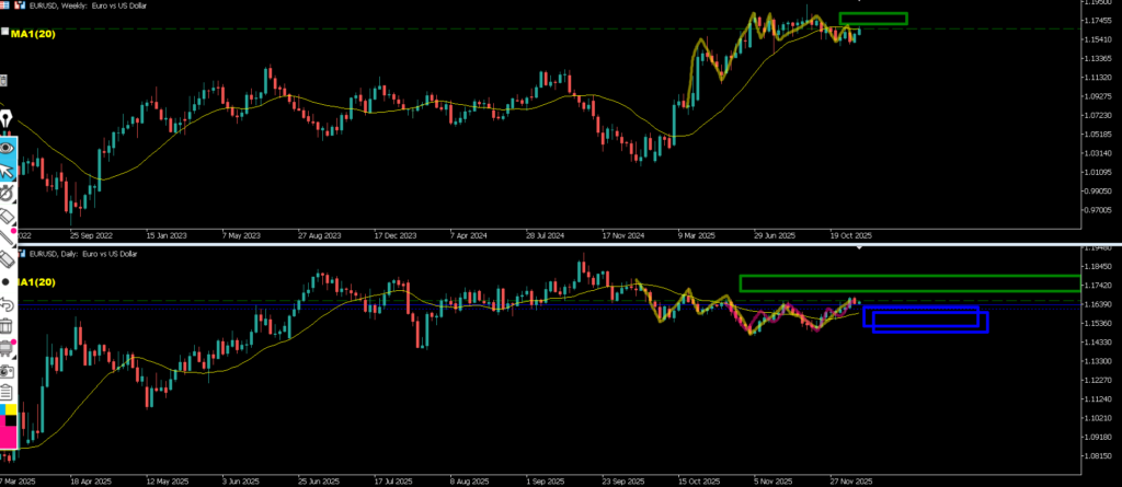 4h上昇の調整でぐちゃぐちゃになっている、ここからだと安値抜けから戻り売りを考えていきたいが来週の話しなので静観する。