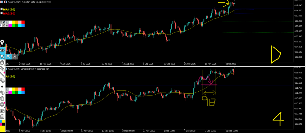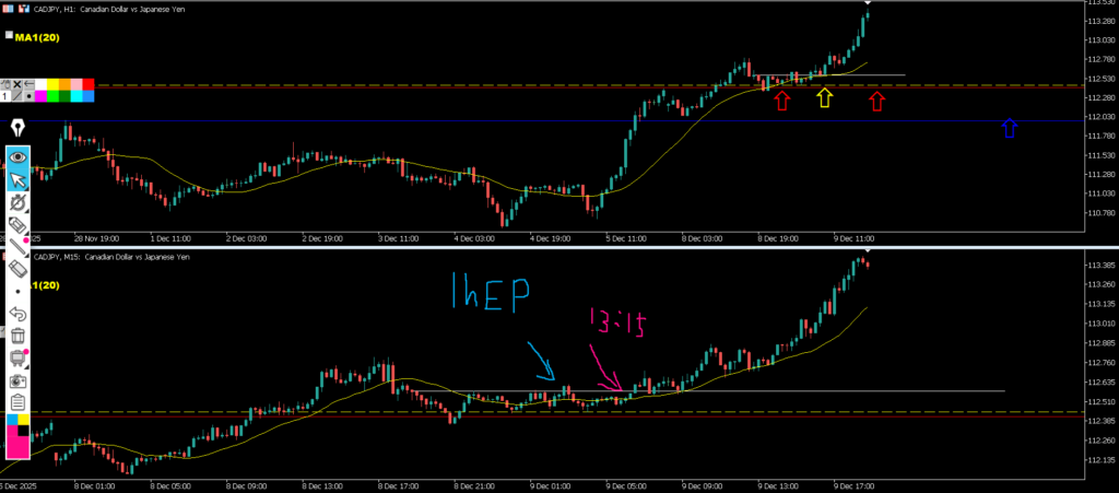 ドル円の日足を下で決めつけた事によりカナダ円のエントリーを考えた際にドル円は日足の真上があるから上昇しにくいなと思ってしまい、カナダ円も同じく上昇しにくいと訳の分からない予想をしてカナダ円のエントリーを躊躇してしまった!