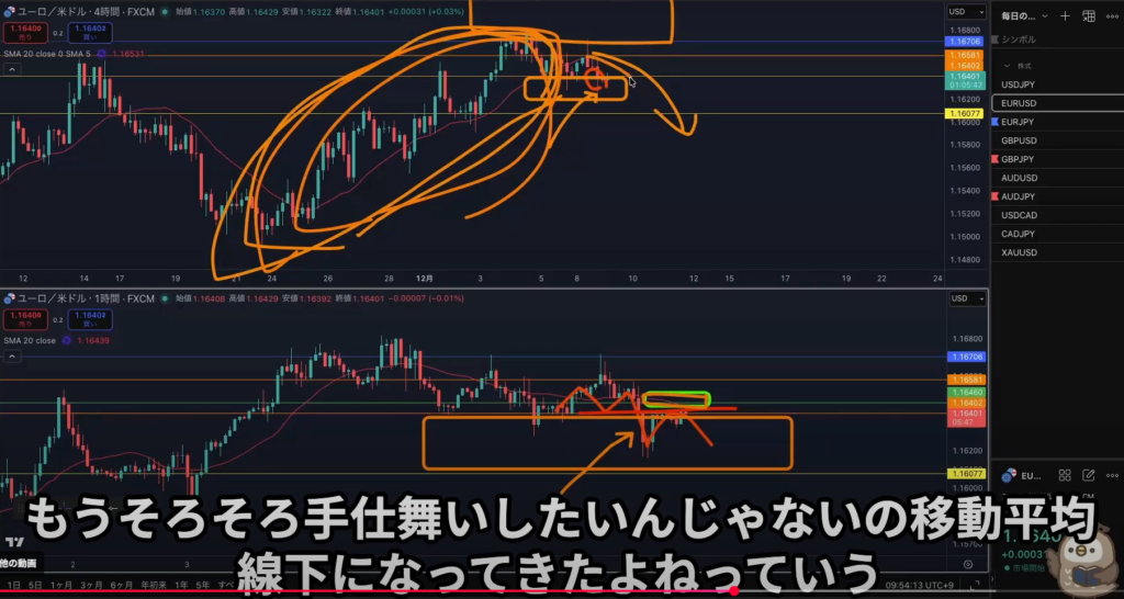 4h買い支えがいる所で下位足で抜けてきても4h確定までに戻されると4hは抜けていない、4hレベルでのサポートラインやレジスタンスラインは逆行しリスクがあるのでブレイクなどで安易に入ってはいけない。