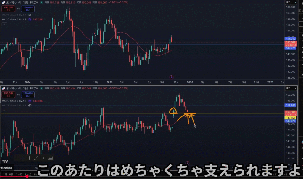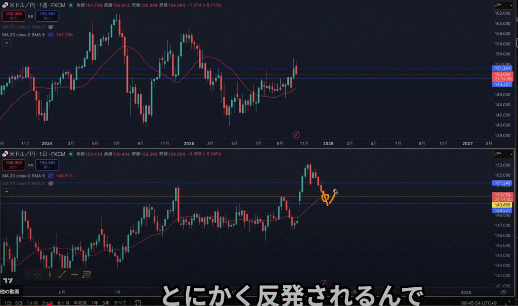 日足MAと日足戻り売り勢力によって日足で大き目のヒゲを付けて戻された、環境認識通り週足は買い支えて日足は戻り売りで戦争状態になりやすい。