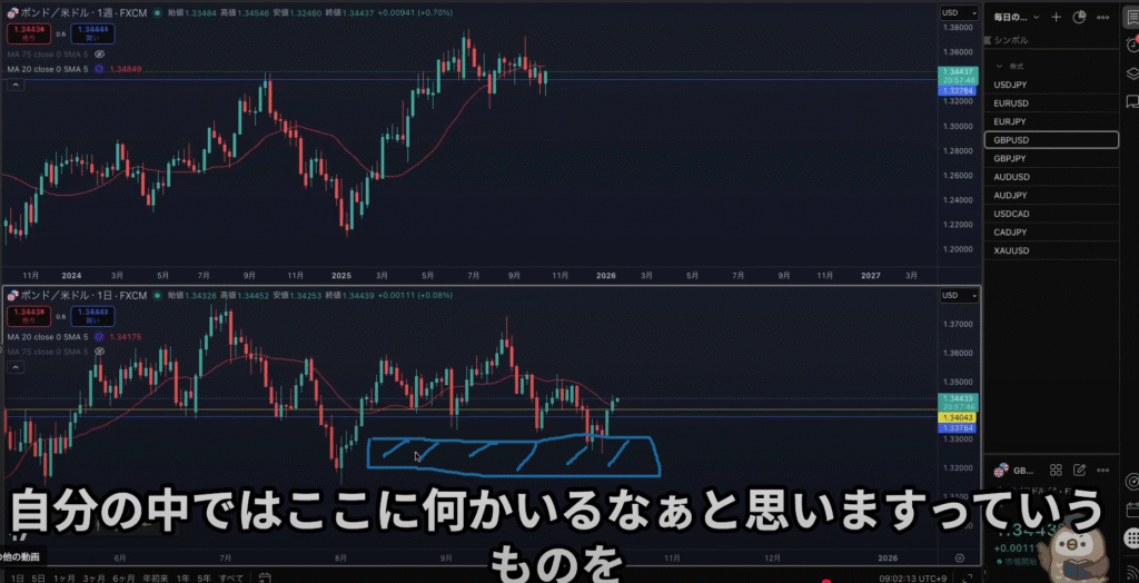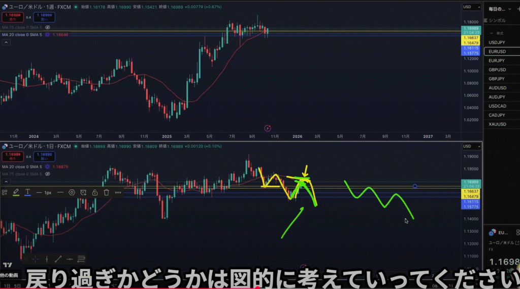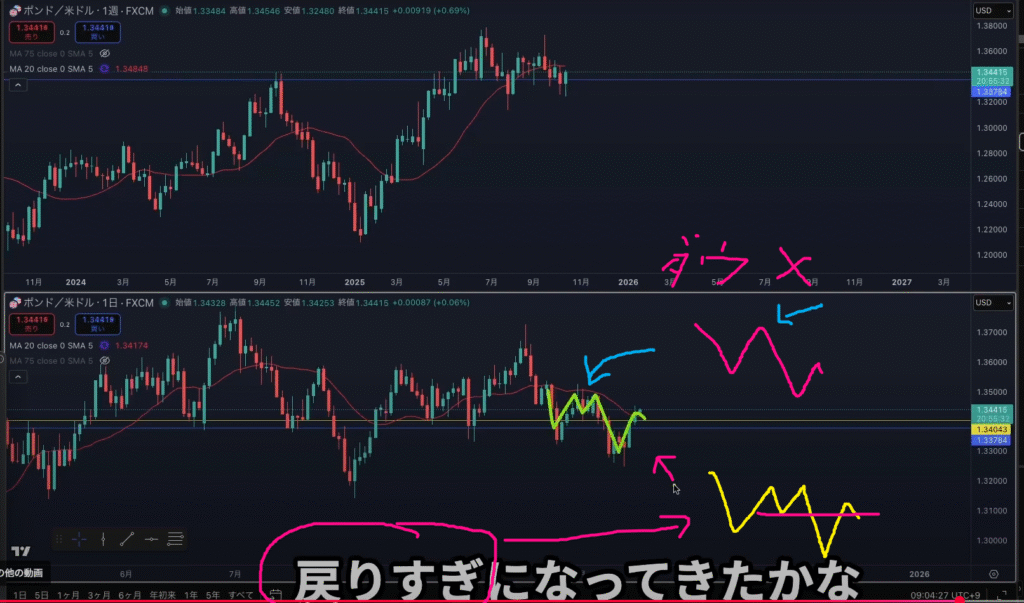 ・今日の日足のチャートで「ユーロは戻し過ぎていない」「ポンドは戻し過ぎている」この違いを理解できるようにならないといけない!