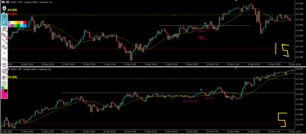 前日押し目買いを狙っていたが水平線を抜けてきてので諦めたが、今日ほぼ全戻しになっていたので1hトレンド発生を待ってエントリーを考えていてそのポイントが来たので、1h押し目買いの15mネックライン抜けで入った。