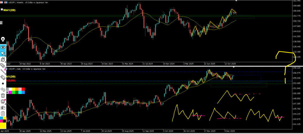 ・浅い方の水平線で止まって来ているが週足のダウ的には深い方で見られていると感じるMAも深い方であれば支えてくる可能性もあるので、止まったと判断はせずまだ水平線がどちらで見られているかがまだ分からないとしておきたい。