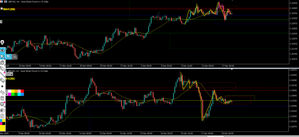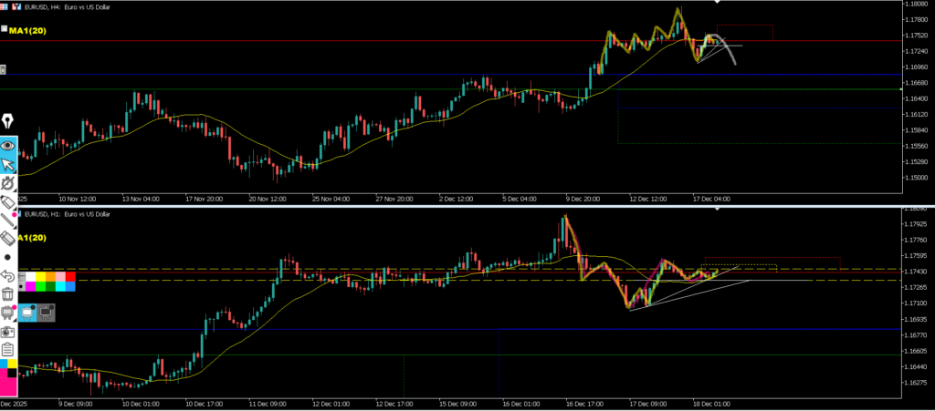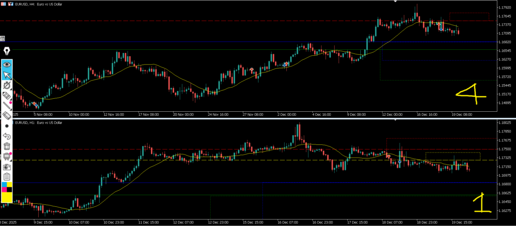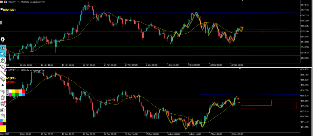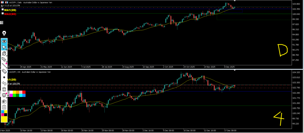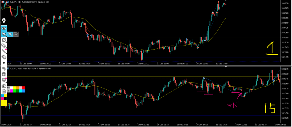 4hの実体は浅い水平線で止まり、4hヒゲは深い水平線ではなく水平線を引いたローソク足の実体で止まって環境認識通りどちらの水平線も意識され4hMAにも支えられた結果となった。