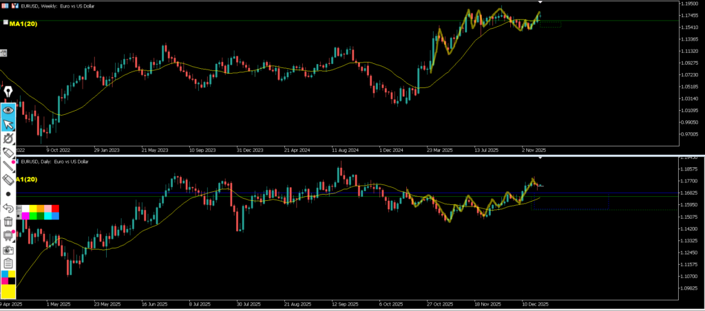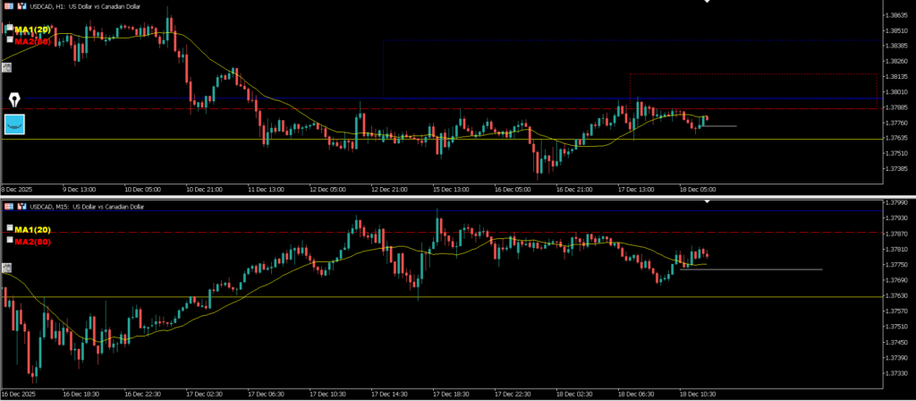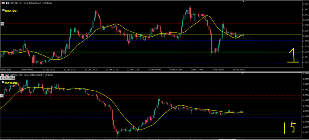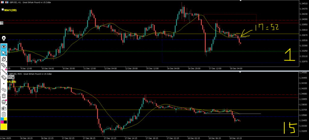 日足は上昇の勢いが弱まっているように感じる中で、4h戻し過ぎからの下降なので1hトレンド発生を待って15mネックライン抜けのエントリーを考えていきたいが、日足のサポートライン上にいるので通常だとエントリーは避けるが週足が下目線でMAに抑えられているのでロットを下げてのエントリーを考えていきたい場面。