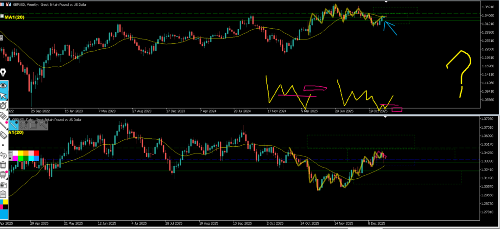 ・複数のダウカウントが考えられる、矢印がTTSにも見えるがダウが小さいので日足のダウガ見えていると判断し下目線で見ていきたい。
