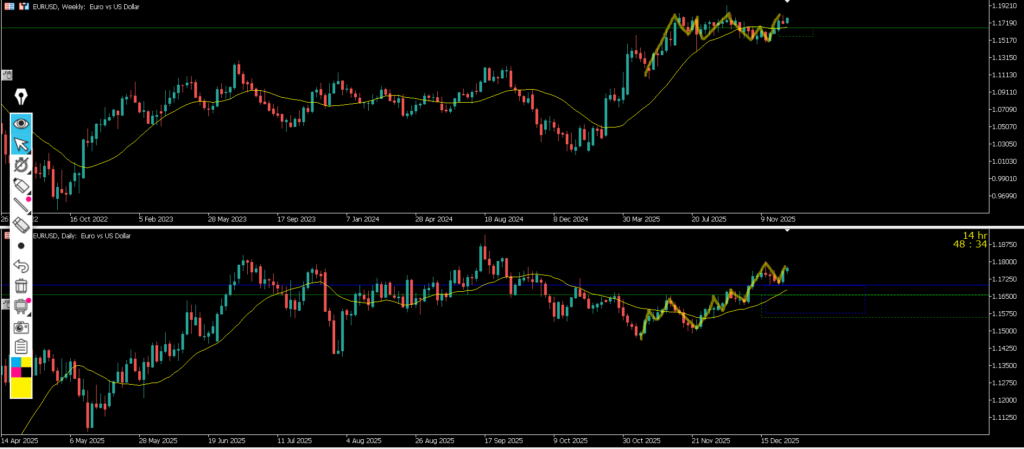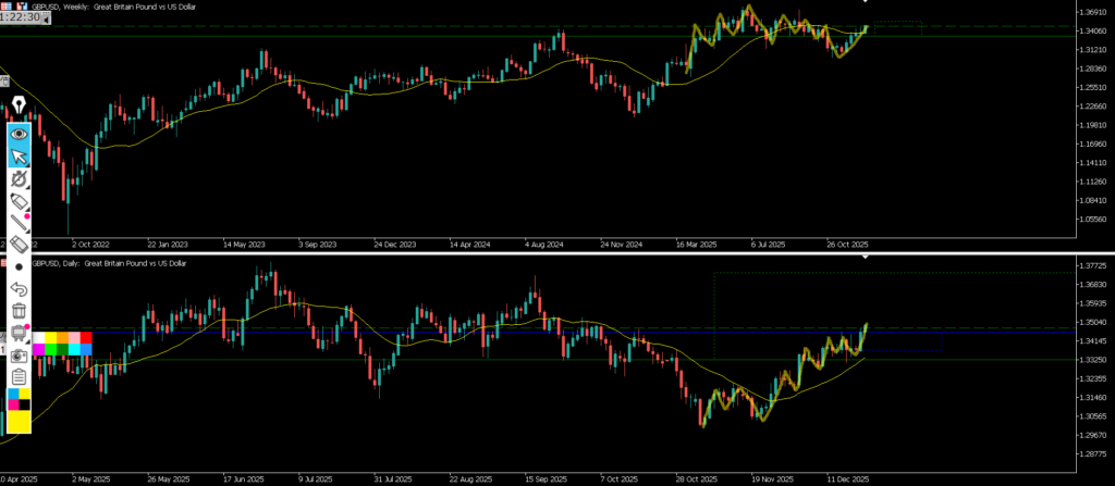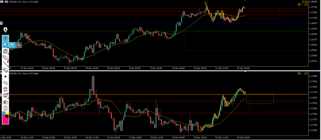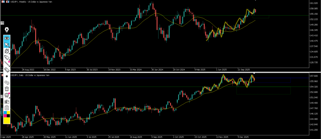日足前回高値実体付近で意識されている4hはここから止まってきたら押し目買いを考えていきたいが、一つ下の4h前回安値の実体に引いた水平線が意識される可能性もあるのでダマシには注意していきたい。