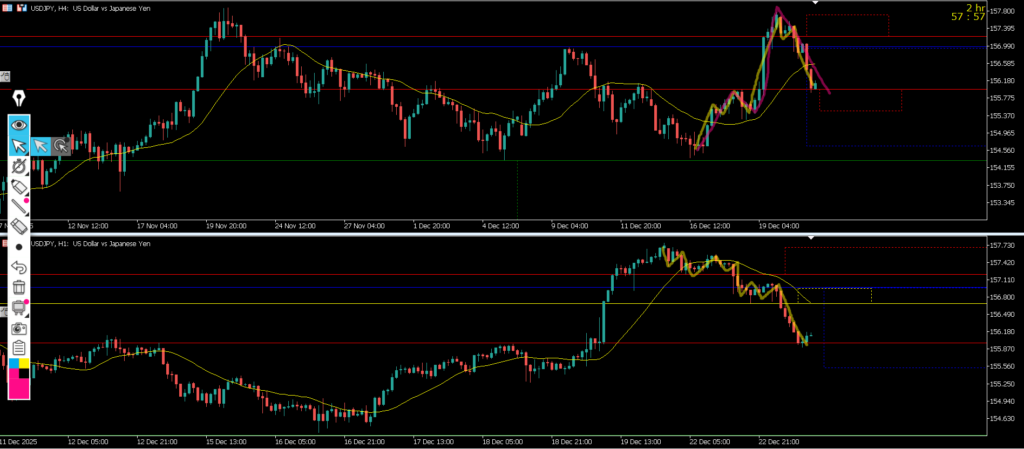 4h前回安値までは戻さず存在確認が出来ていない良く分からないところで戻り売りになったのでスルー、さすがに無いとは思うが画像の様に日足のダウが大きく見られていて4hの下降は日足の押しの波なのだろうか?