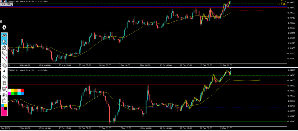 結果的に4h黄色のダウカウントで見ていた浅い水平線で止まって押し目買いになったが、かなり足の早い波だったのでこれは取れなくて大丈夫。