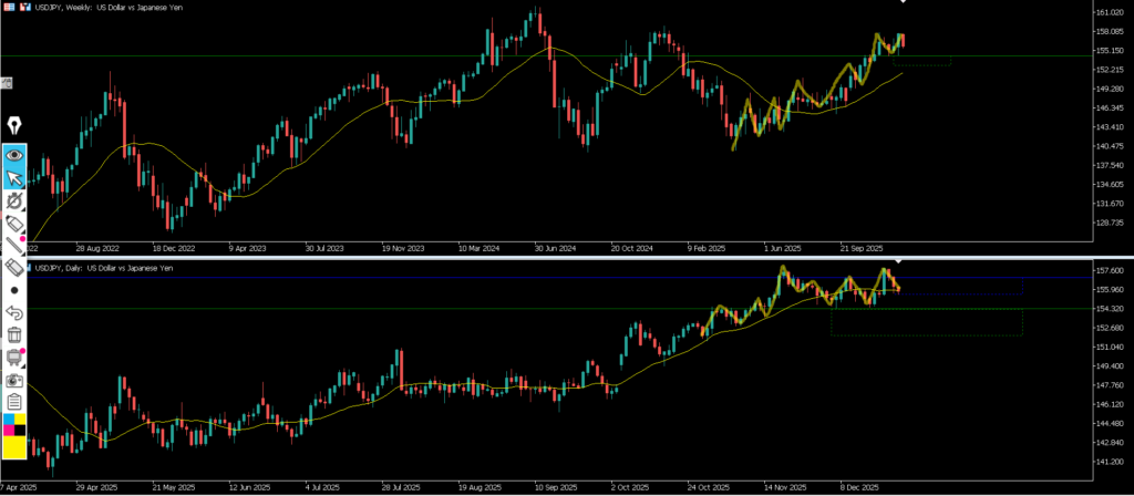 4hはヒゲをポキッと折って戻り売りと考える事も出来るが4h前回安値は抜けてなく止められつつあると判断、4hMAも上向きで日足MAも支えている状態の為上昇の可能性もあるので4h明確な高安抜けまで静観する。