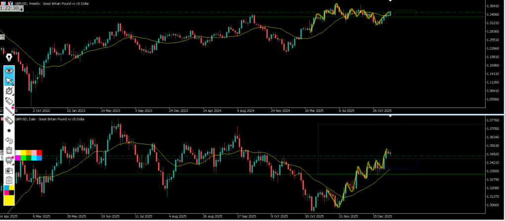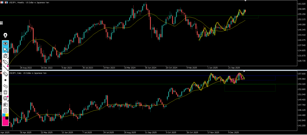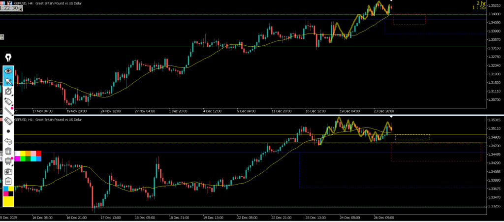 アメリカはクリスマスであまり値動きが無い中4hは少し上昇してMAを上抜けた、前回高値のヒゲを越えて上になったかは微妙