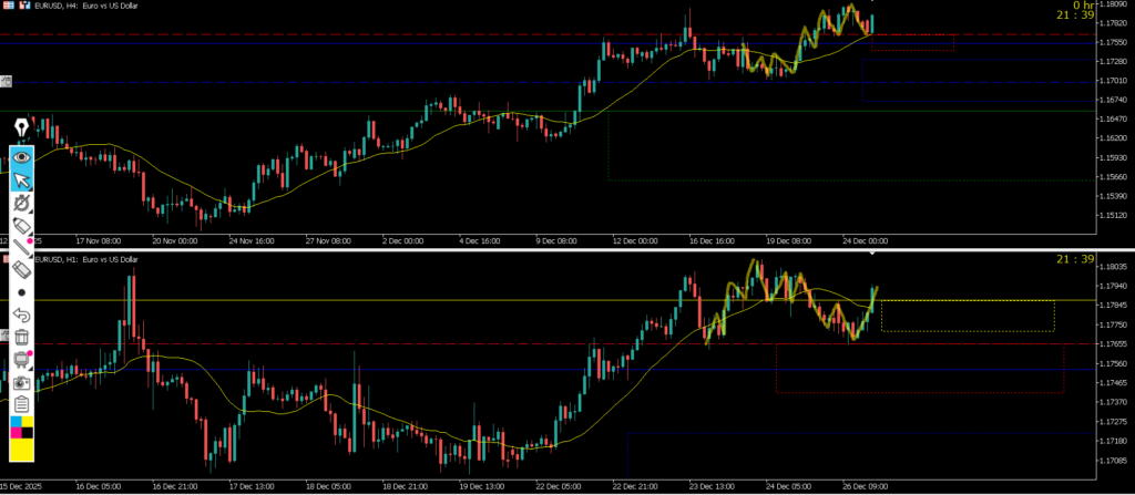 アメリカはクリスマスであまり値動きが無い中4h引き続きヨコヨコで高安抜けは起こらなかった。
