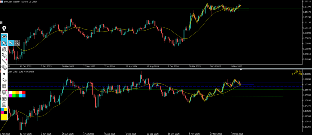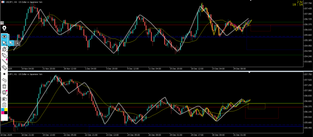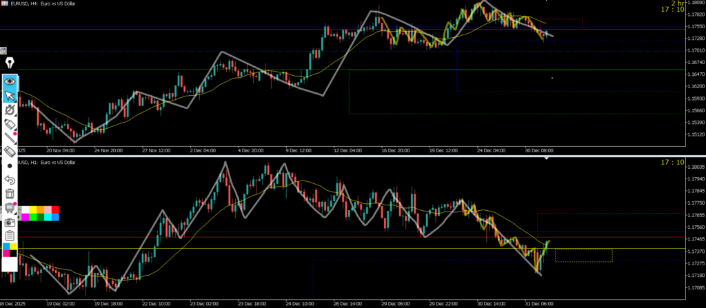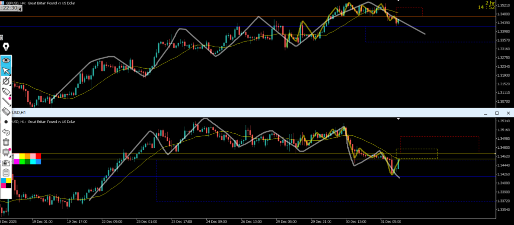 4h水平線と1hレジスタンスラインが殆ど同じで1hで二本のラインまで戻って来て下降したが日足の真上と日足のMAに戻され1hで大きな下ヒゲとなった、元日に向けてチャートが止まった