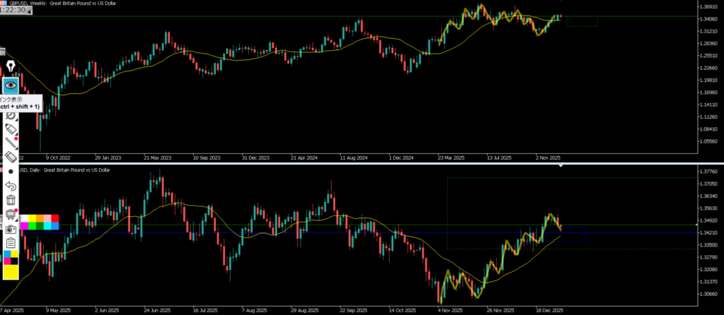 4h戻しの波の途中なので水平線で止められたら戻り売りを考えていきたいが、日足はMAに支えられてギリギリ押し過ぎではないので押し目買いの上昇に気を付ける