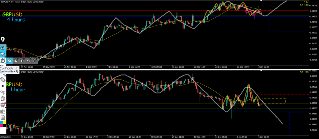 緑が週足 青が日足 赤が4h 黄色が1h