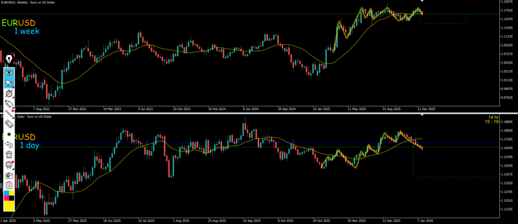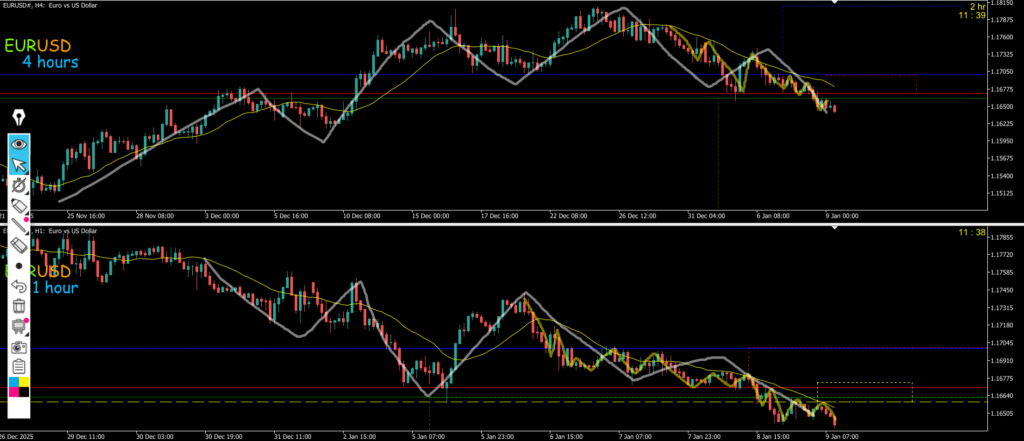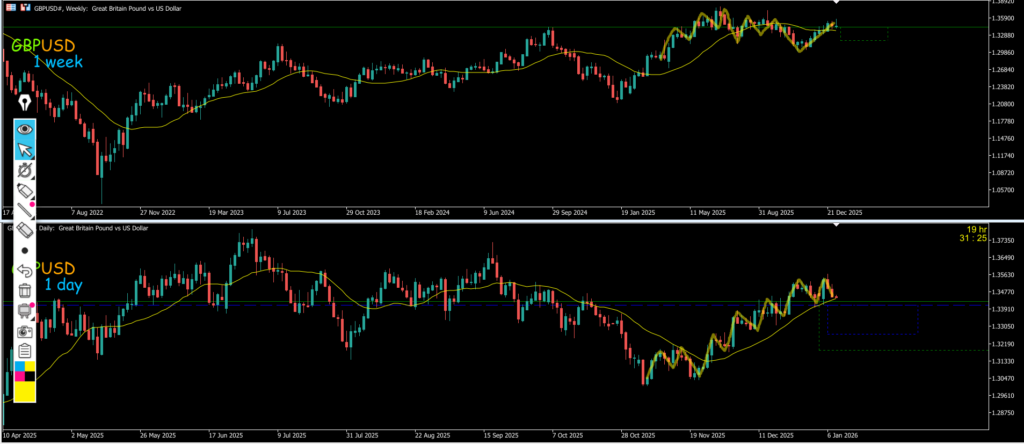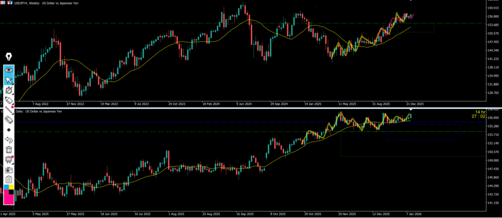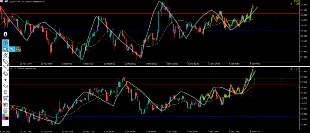 週足MAが支えてきていて日足のMAは抑えてくる可能性があるので下位足では戦争状態になりやすく、4hは日足のサポートラインで止まっている1hは既にヨコヨコになっているので4h明確な高安抜けまでは静観する。