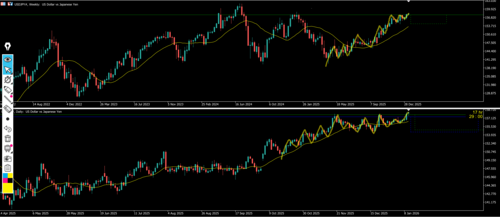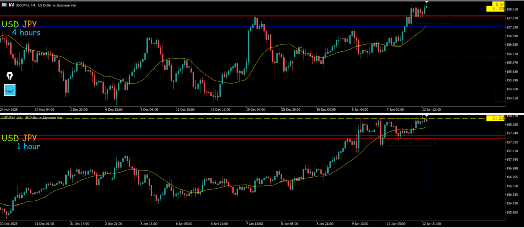 週足日足と上昇の波の途中で4hは早い足での押し目買いになって上昇中なので4h明確な高安抜けまでは静観する