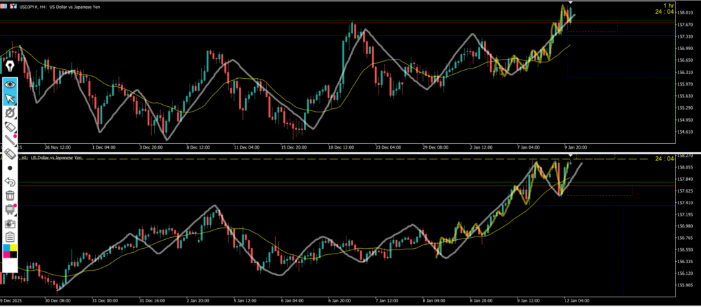 戦争状態のヨコヨコは続かず4h一気に上昇して高値を抜けて4hは押しの波の途中