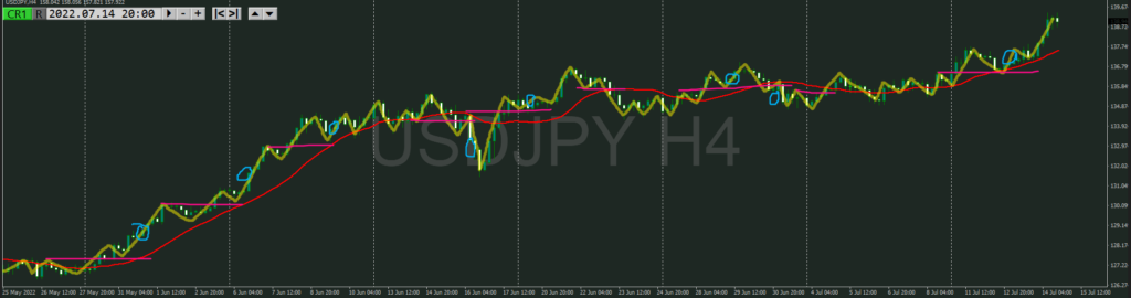 ・点線を抜けると上目線でトレンド転換シグナルになる