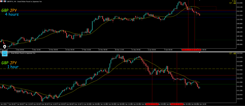 4h水平線で1hが止まったのでエントリーを考えていきたいが4hの波的には欧州前後に感じるのでそれまでは静観する、1hがもう少しヨコヨコ状態になって4hMAが下向きで抑えてきて1hMAがグランビルしてくればエクセレント、波が出た場合は週足日足のサポートラインで止められやすく日足の押しの波になる可能性がある
