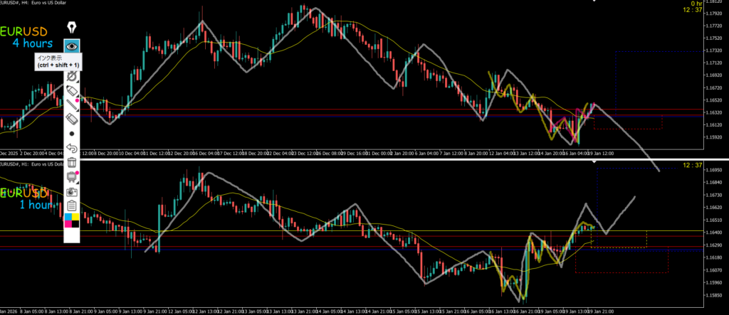 4h水平線で止まればエントリーを考えていきたいMAも支えている、ただピンクのダウカウントで大きく見られている可能性もあるその場合は4h戻り売りで1h反転がエントリーポイントになる