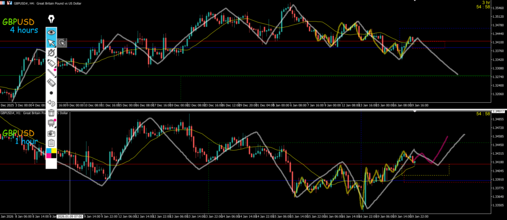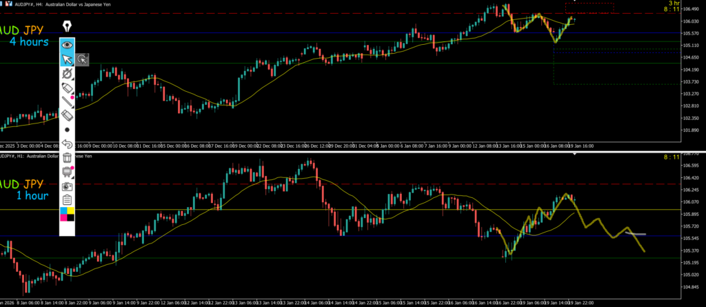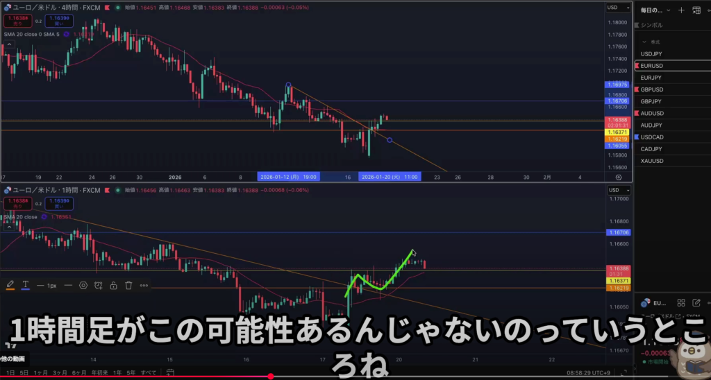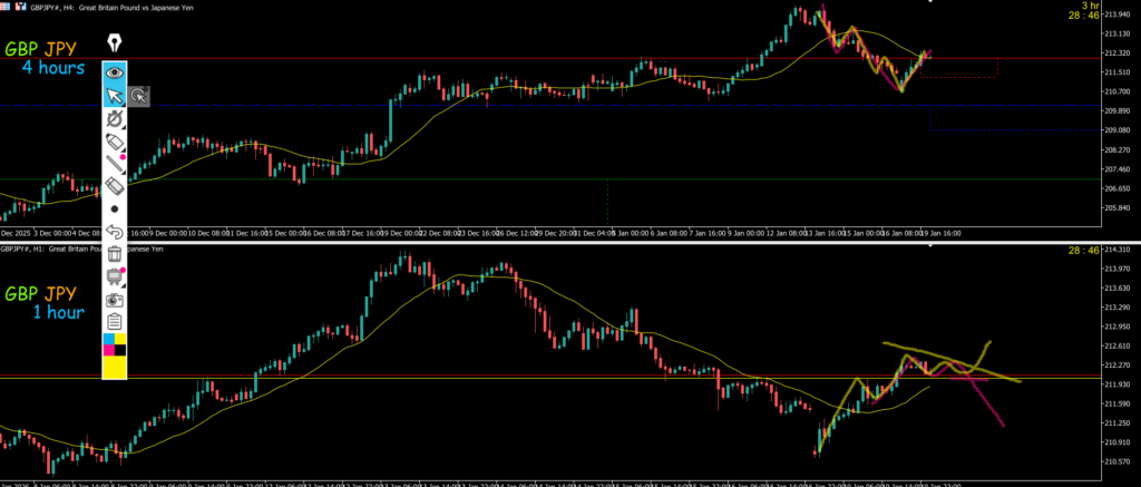 4h水平線で止まればエントリーを考えていきたいMAも支えている、ただピンクのダウカウントで大きく見られている可能性もあるその場合は4h戻り売りで1h反転がエントリーポイントになる