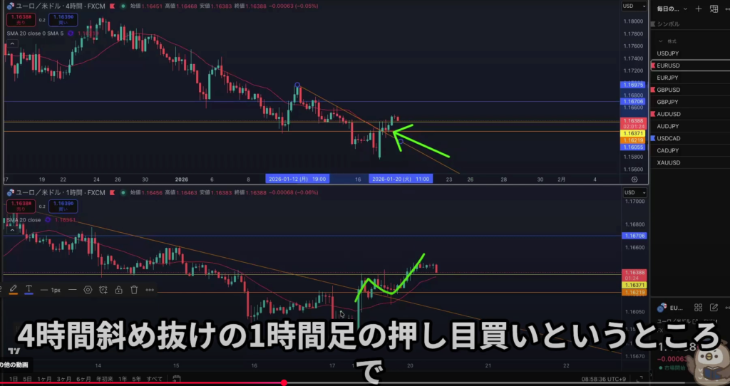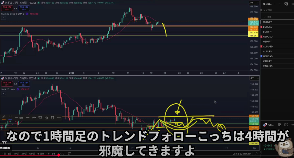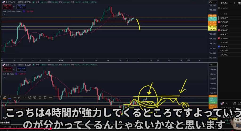 昨日の4h斜め抜けからの1波狙いの解説を聞いたが自分にはまだまだ早いと感じた、分りやすい4h押し目買い戻り売りが取れる様になってからやな