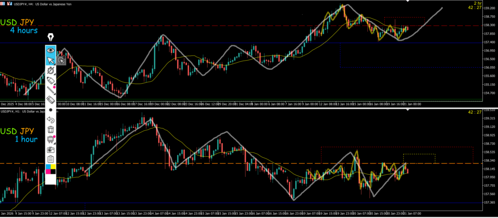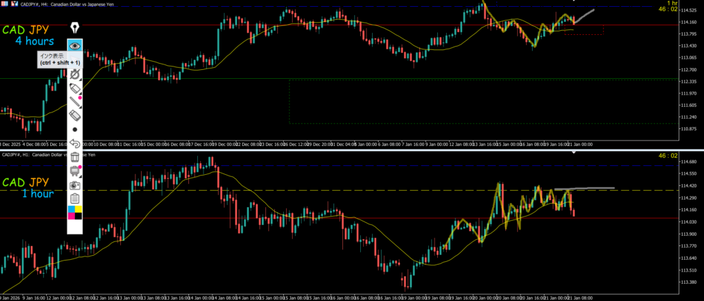 4h上昇の調整のヨコヨコになっていて明確な高安抜けは無かった