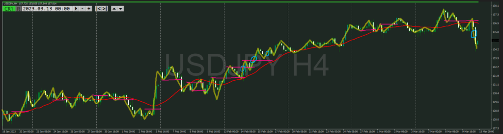 ・点線を抜けると上目線でトレンド転換シグナルになる