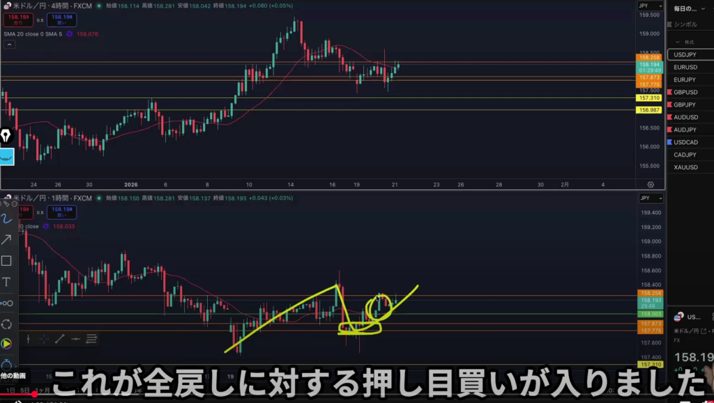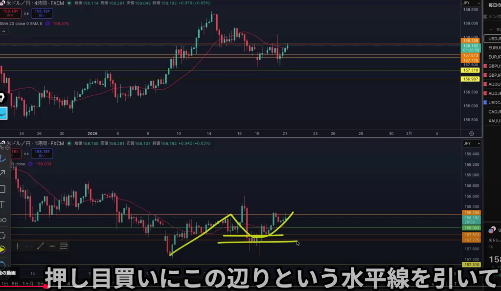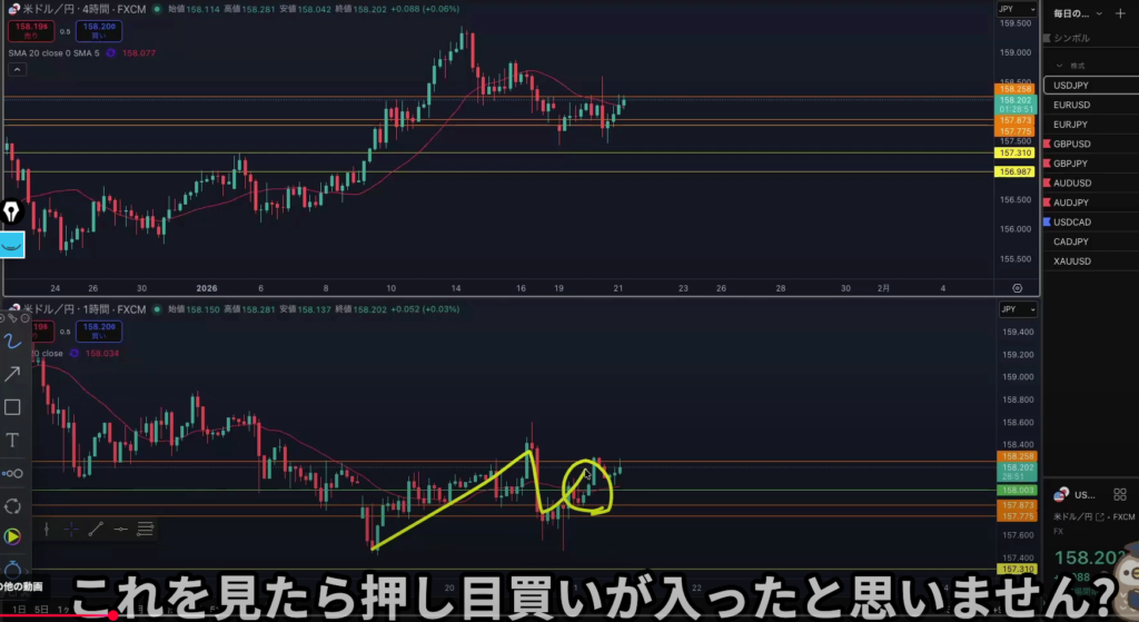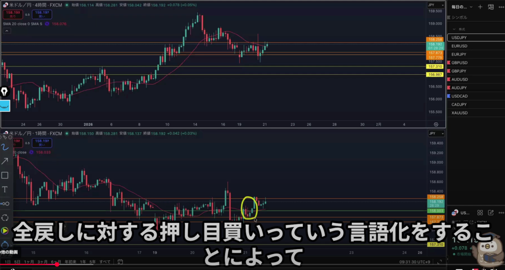 4h全戻しの上昇に対する押し目買いが入る可能性があるので入りやすいところに水平線を引く事によって、全戻しに対する押し目買いが入ったと認識出来てその上昇がなぜ起こったのかを言語化できる、そしてその後に上昇しなかった場合はやり過ごせたと自分の自信に繋がる。