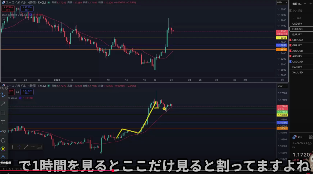 4h押しを付ける事なく1日中上昇が続いていてようやく1hでは上昇が止まったところ