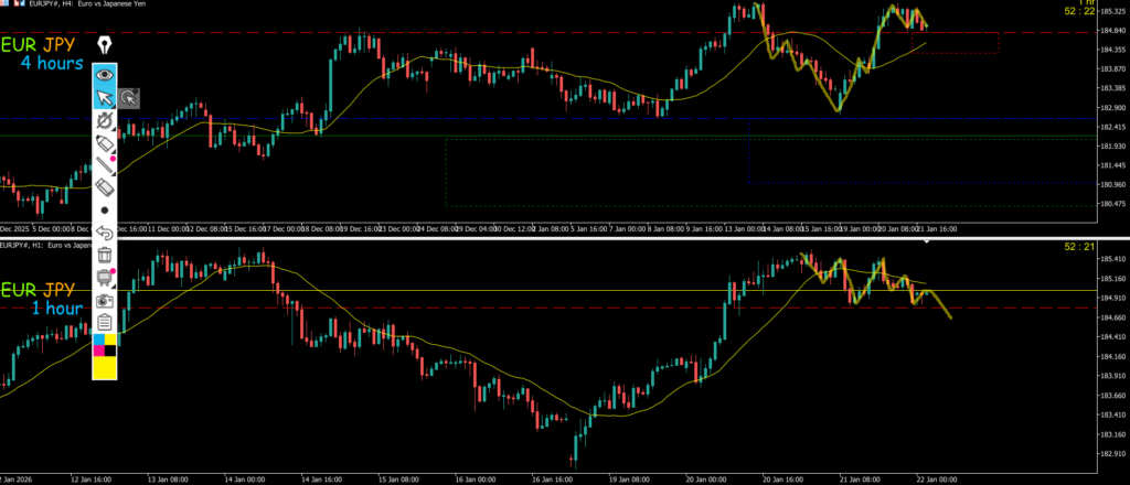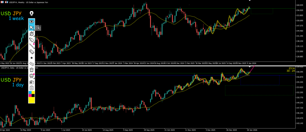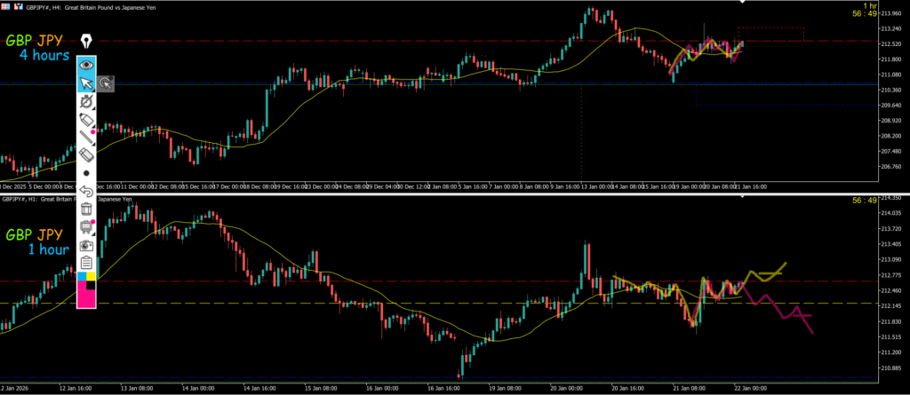 日足は前回高値で止まりかけている4hは上昇の調整のヨコヨコになりつつあるので、明確な高安抜けまで静観する