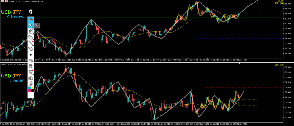 日足戻しの波の途中で4h全戻しなので4hは1hトレンド発生を待って15mネックライン抜けでのエントリーを考えていきたい、ただ日足MAが支えて来ているので4hMAが抑えて来た場合は戦争状態になりやすい