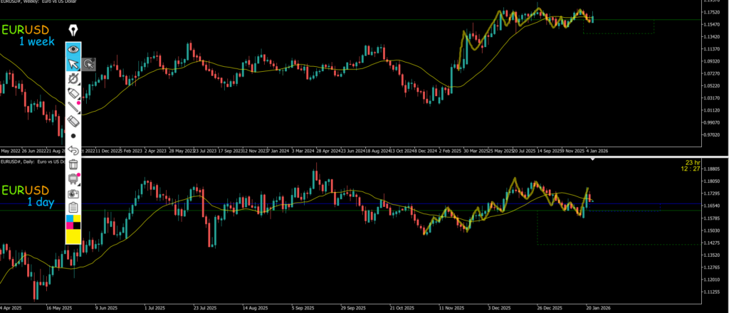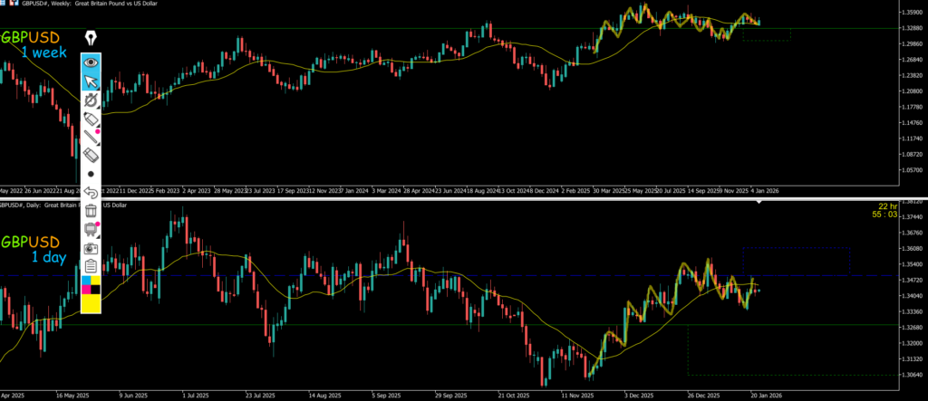 週足は上昇の波の途中か売り抑えられているのか微妙な状況、日足は押し目買いで水平線で4hが止まっており4h反転がスイングトレードのエントリーポイントになる、4hはヨコヨコなので明確な高安抜けまで静観する