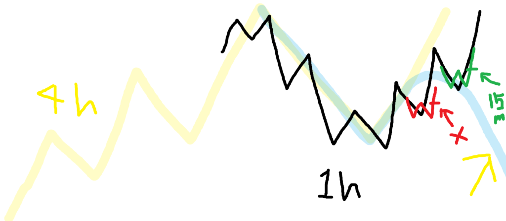 赤の矢印は1h押し目買いではあるが1hトレンド発生はしていないので違う、緑の1hトレンド転換後の押し目買い15mネックライン抜けエントリーが正しい