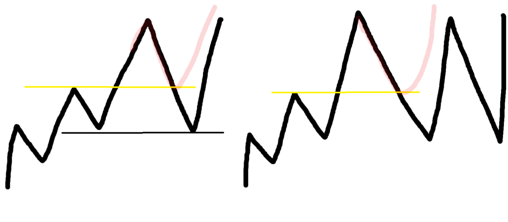 全戻しとは画像左のように水平線で赤い波の押し目買いが入らず前回安値付近まで戻ってきた場合を言う