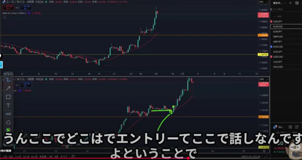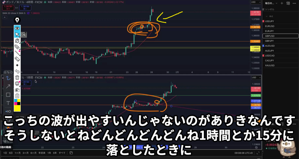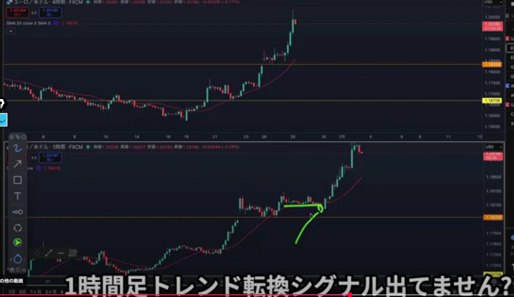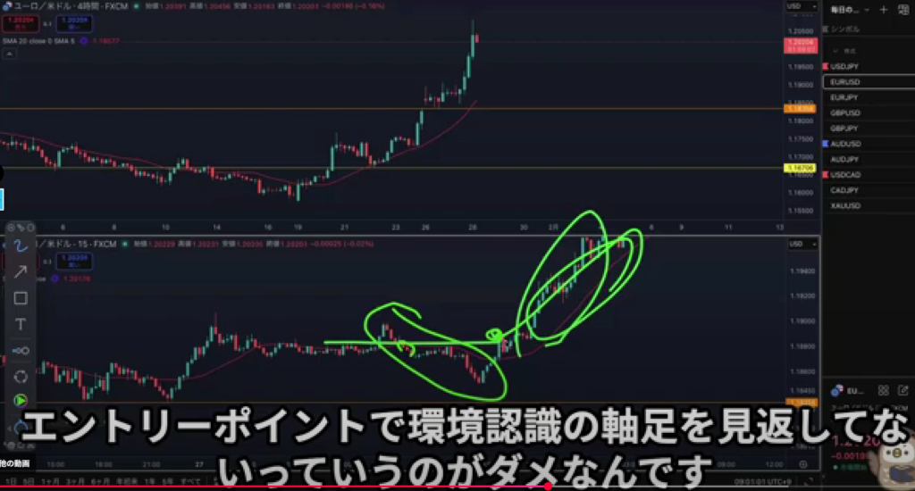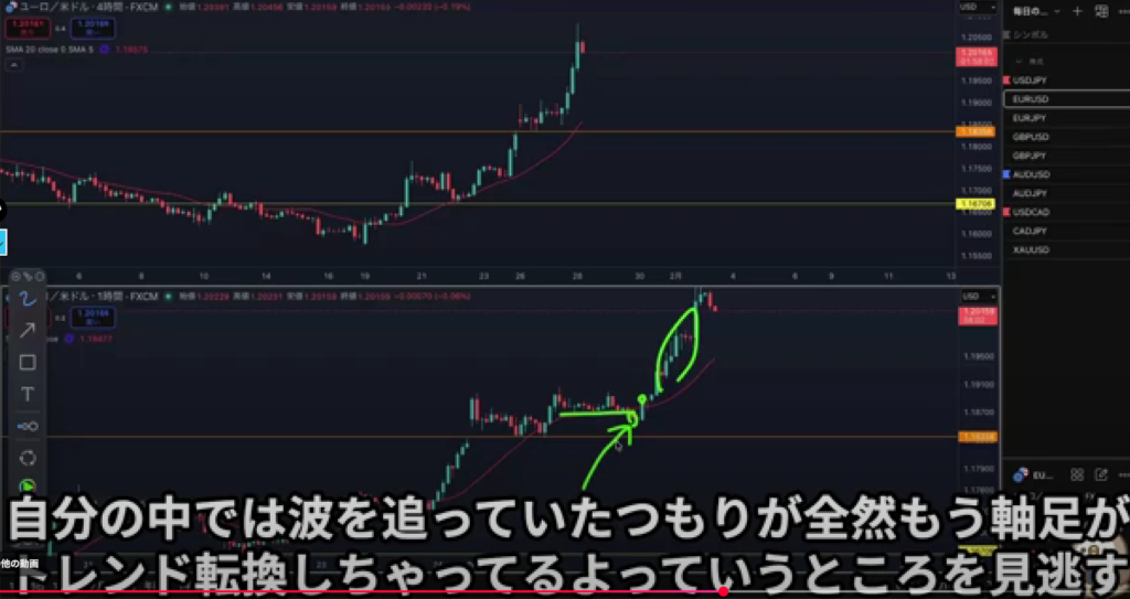 損切後にどこおわで再エントリーを狙っている時に下位足ばかりで見続けるとエントリーポイントが来た時に軸足はトレンド転換していて軸足では全然エントリーポイントではないという事があるので気を付けないといけない。