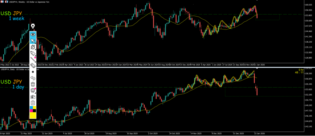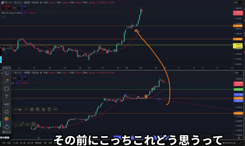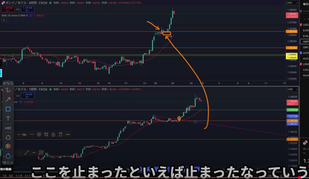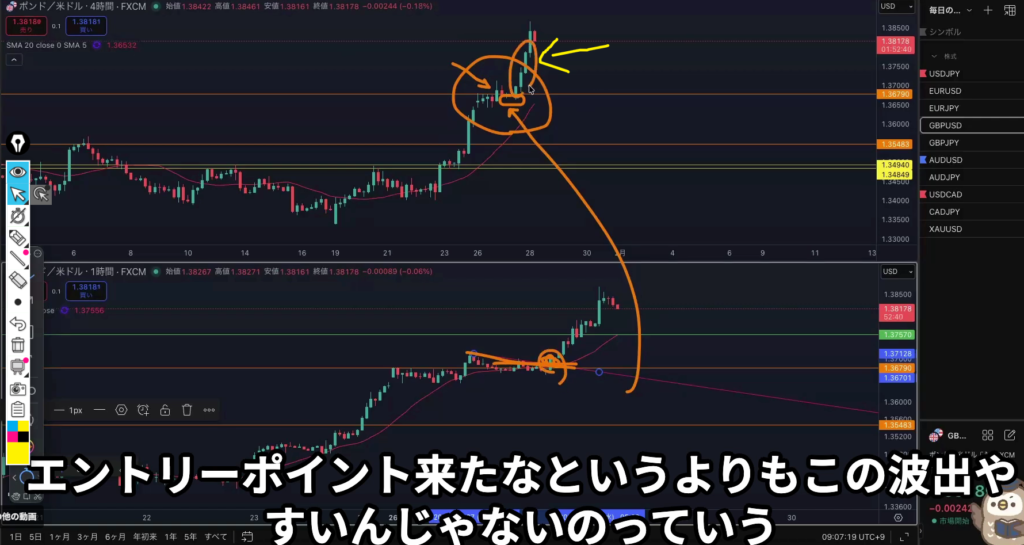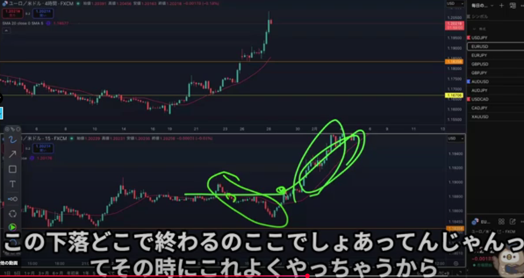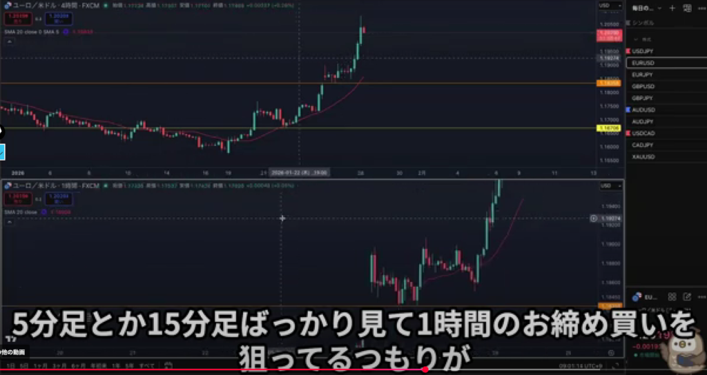 損切後にどこおわで再エントリーを狙っている時に下位足ばかりで見続けるとエントリーポイントが来た時に軸足はトレンド転換していて軸足では全然エントリーポイントではないという事があるので気を付けないといけない。